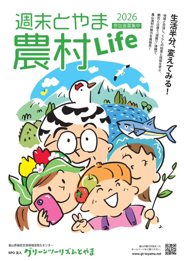 富山県の農村地域における農作業、生活の体験、伝統文化の体験、地域の方との交流などが体験できる農村生活体験講座「週末とやま農村Life」について、